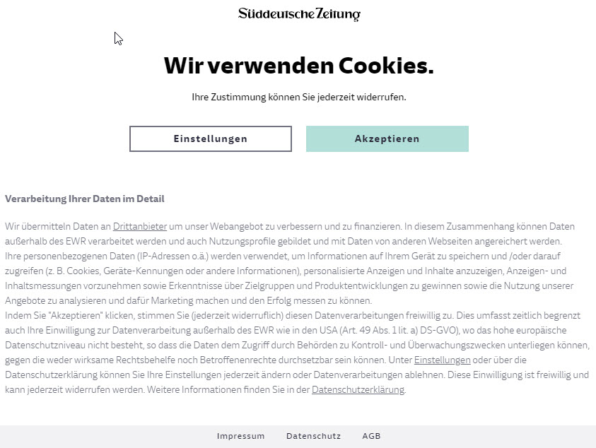 Die sparsame Erhebung von personenbezogenen Daten in Kombination mit der individuellen Auswahl der Werbekunden reduziert die Datenverarbeitung erheblich. Als Süddeutsche Zeitung kümmern wir uns darum, dass Sie als Abonnent von diesen Vorteilen automatisch profitieren. Wenn Sie Ihre Einstellungen dennoch persönlich vornehmen und individuell anpassen möchten, können Sie dies jederzeit in den Datenschutz-Einstellungen tun.