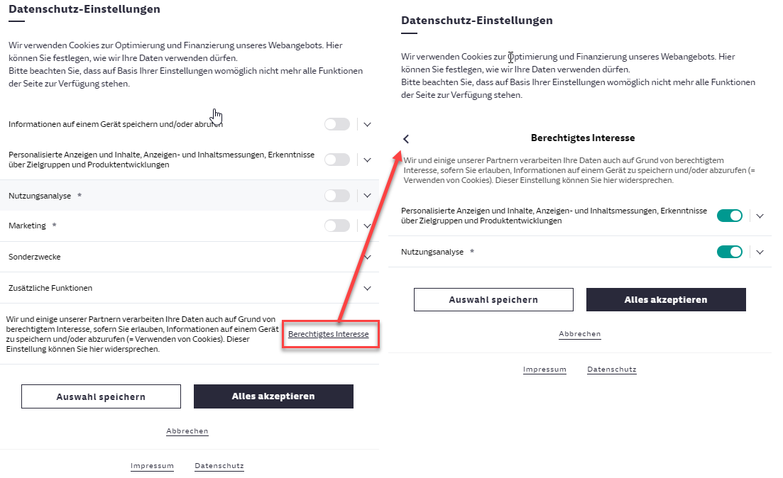 Sie können der Verarbeitung aufgrund berechtigter Interessen jederzeit widersprechen, indem Sie unter der Kategorie „Berechtigtes Interesse“ die entsprechenden Verarbeitungen gleichzeitig oder einzeln ausschalten.